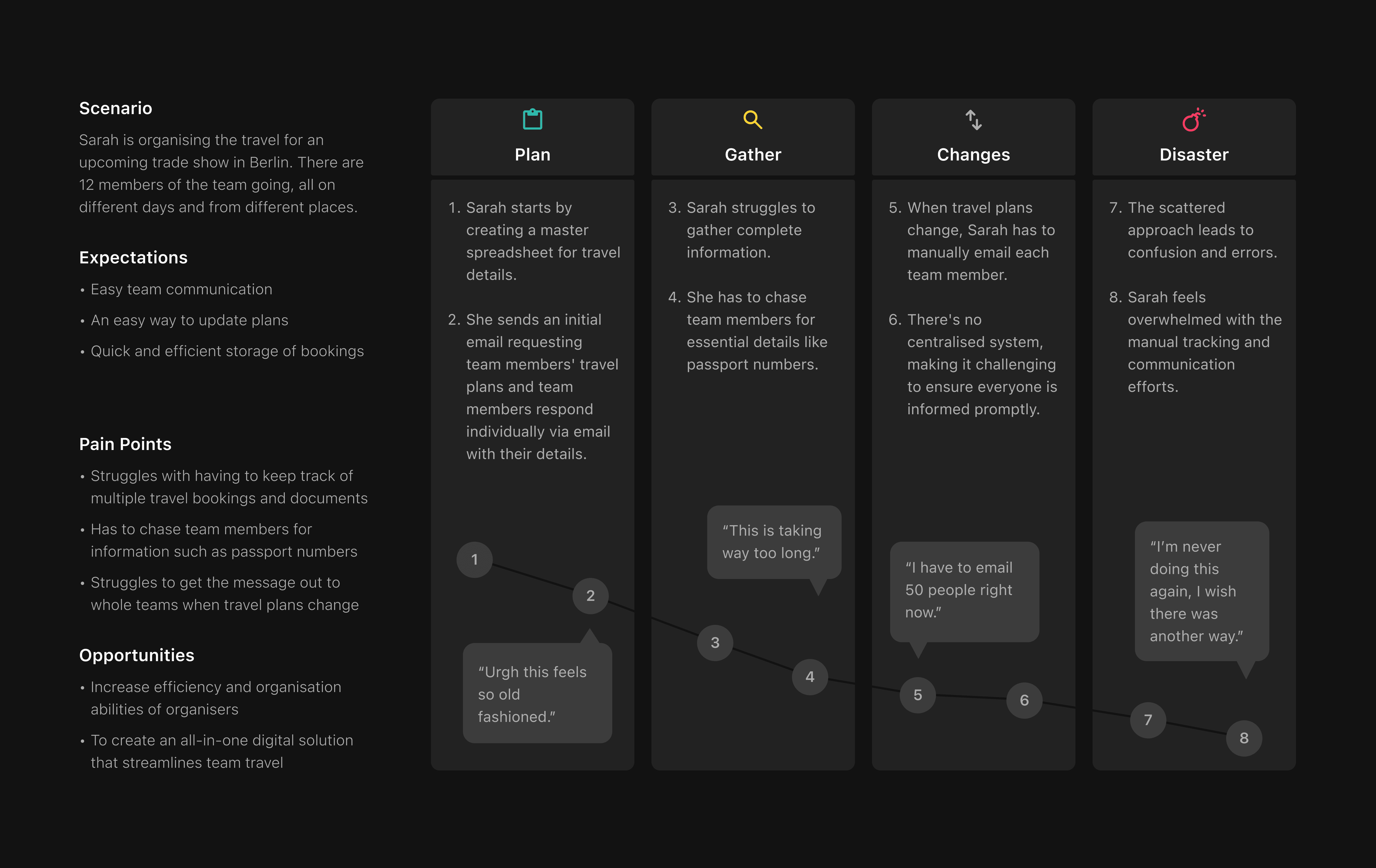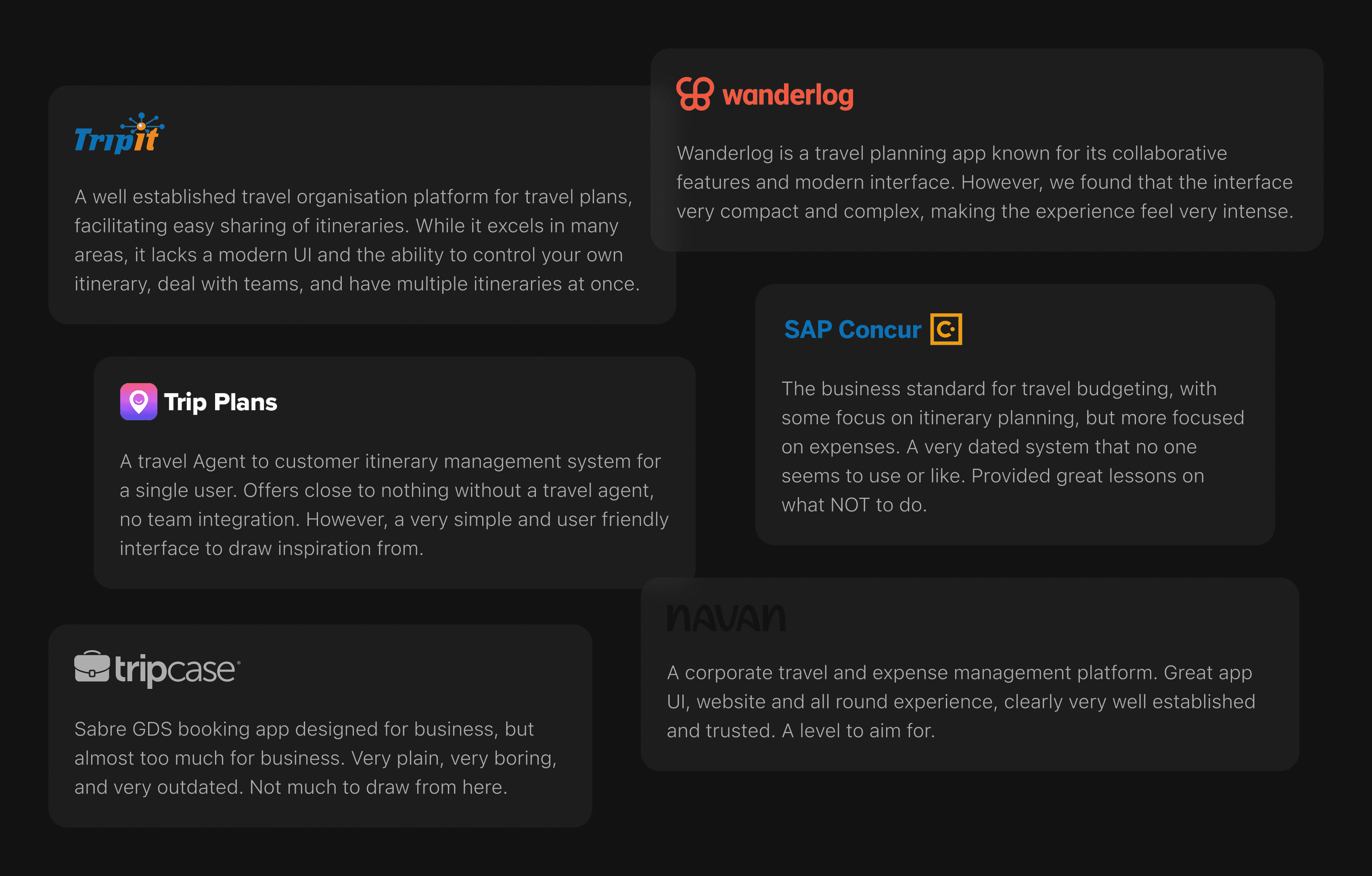 We also meticulously evaluated other applications currently available in the market such as TripIt, Wanderlog, Navan and SAP Concur. Our objective was to assess their design and usability, identifying strengths and weaknesses through testing scenarios.